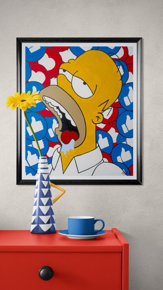 This painting is a humorous portrait that highlights our addiction to social media and the constant need for validation.